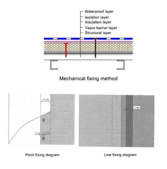 1.Construction process of mechanical fixing method: base surface cleaning → laying polyethylene film and insulation board → pre-laying PVC waterproof membrane → fastening with fasteners → hot air welding → reinforcement of joints → inspection and repair → acceptance.