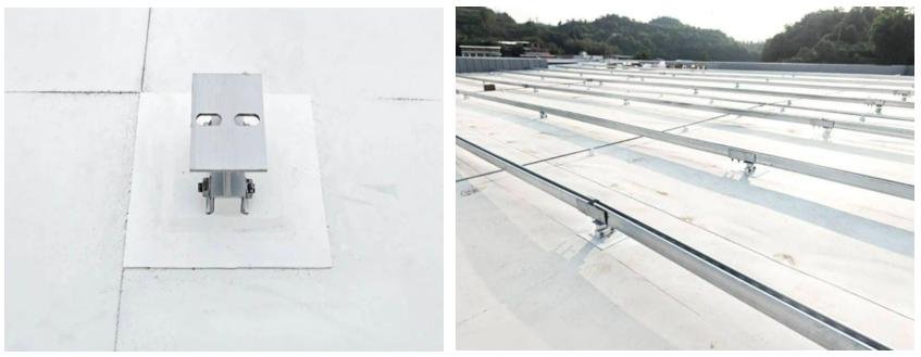 3.2 Welded Flexible Support System:This system uses flexible supports that are directly welded to the exposed waterproof layer without damaging the waterproof layer,effectively ensuring the waterproof effect.Furthermore, the use of TPO material for the flexible supports further reduces the load compared to heavy-duty supports. However,the welded flexible support still needs to be combined with aluminum alloy guide rail brackets and panel photovoltaic power generation systems,resulting in limited overall system load reduction (Figure 4).
