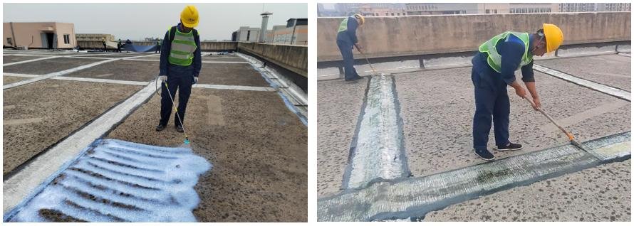 5.2 Waterproofing Base Surface Treatment: If the roof concrete is severely weathered,powdery,or delaminated, use a chisel or small shovel to remove loose fragments detached from the base.Then sweep away the debris and foreign objects with a broom,and fill with cement mortar. Allow it to dry before proceeding with subsequent construction.Spray the special primer onto the base surface,ensuring even coverage without any exposed substrate or accumulation (Figure 5).The membrane can only be installed after the primer has been sprayed and reached a dry, non-sticky state.The membrane should be laid on the base as soon as possible after applying the primer to prevent secondary dust contamination.Since the original roof joints are covered with self-adhesive bitumen waterproof membrane,a special 2142 adhesive should be applied to the surface of the original self-adhesive bitumen membrane to improve the adhesion between the butyl self-adhesive TPO membrane and the base layer (self-adhesive bitumen membrane) and reduce hollow areas (Figure 6).