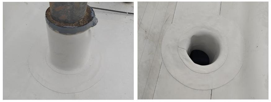 ② Straight drain outlet:Weld the H-type TPO membrane into a cylindrical shape and place it inside the rainwater pipe.Seal the bottom with silicone sealant and hot-air weld the top to the roof TPO waterproofing layer (Figure 9).