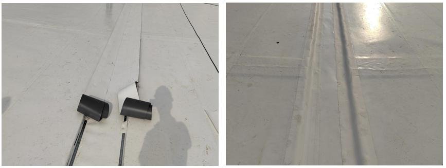 5) Photovoltaic module welding is performed by using a handheld welding gun to weld the TPO material on the short side of the module to the TPO waterproof layer on the large side.The joint surfaces to be welded should be cleaned with a cleaning solvent in advance (Figure 17).