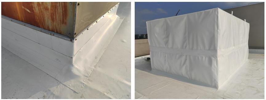 ③ Roofing equipment:For equipment that needs to be exposed,use H-type TPO rolls to turn up,fix the top with a sealing strip and seal with sealant,with a height of not less than 250 mm,and weld the bottom to the large TPO roll (Figure 10);for equipment that does not need to be exposed,use H-type TPO to bond and wrap the whole, and use homogeneous H-type TPO to reinforce the middle waist belt (Figure 11).