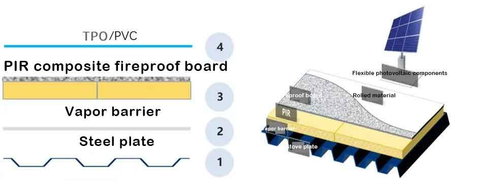 Based on PIR insulation materials,we have developed an integrated PIR roofing insulation and waterproofing application system:a single-ply waterproof roofing membrane system.This unique system consists of,from bottom to top,a structural layer,a vapor barrier,an insulation layer,a cover layer,and a waterproof layer.The waterproof layer is typically constructed using high-performance,exposed waterproof membrane.