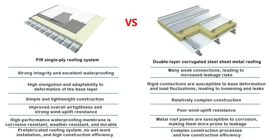 In industrial plants, the traditional approach is to use a double-layer steel plate sandwiched with rockwool (glass wool) system.The single-layer PIR waterproof membrane roofing system offers significant performance advantages over double-layer steel plate systems.In terms of project cost,PIR single-layer waterproof membrane roofing also has a price competitive advantage.The comprehensive cost of the system is approximately between 200 and 220 yuan/㎡,which is basically the same as the cost of double-layer steel plate metal roofing system and rock wool single-layer roofing system.